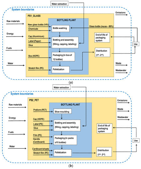 23]. More in detail, the FU was the packaging (considering all the components of the system) needed for bottling and distributing 1 L of natural mineral water and 1 L of sparkling mineral water. For this purpose, only the bottles of 1 L size were considered. Considering the real case of the water company under study, the two types of water were considered separately because there are some differences about: (i) the weight of some packaging components of the PS2_PET system; (ii) the distribution range (see