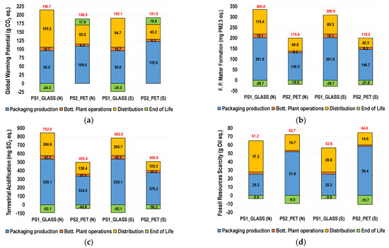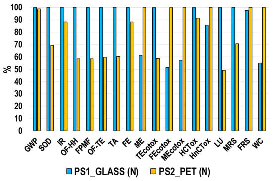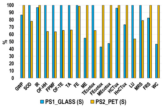 32]. About the distribution phase, the results showed that the contribution of this life cycle step to the impacts of PS2_PET was lower than PS1_GLASS because the former is much lighter, and this means lower fuel consumption as well as lower emissions during the transport phase.