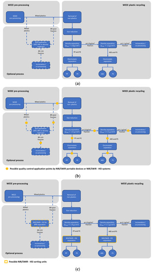 Conventional recycling process of WEEE plastics (a), possible scenarios for quality control applications by NIR/SWIR portable devices and HSI-NIR/SWIR systems (b), and sorting solutions adopting HSI-NIR/SWIR platform (c). Adapted from Haarman et al. (2020).