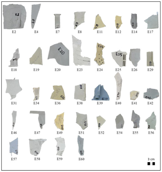 The analyzed plastic samples were collected from the recycling plant of Galloo Plastics (Halluin, France), in which density medium separation is used for concentrating the BFRs plastics from a WEEE stream. The samples consisted of shredded plastic scraps from cathode ray tube (CRT) monitors and televisions. The physical features (i.e., color, thickness, and weight) of the samples are reported in Table 1. In more detail, scraps were mainly made of acrylonitrile butadiene styrene (ABS) and polystyrene (PS) polymers with variable bromine content. Thirty-six scraps (Figure 2) were randomly selected from the samples, and their polymer typology (ABS and PS) was verified using Raman spectroscopy.