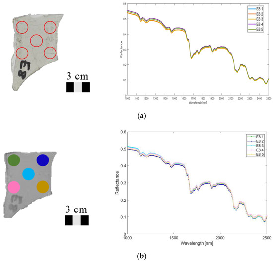Acquired plastic scraps were divided into two classes according to the recommended Br concentration limits [22]: “High Br content” (>2000 mg/kg) and “Low Br content” (<2000 mg/kg), based on XRF analysis. For each plastic scrap, 5 “single spot based” spectra acquisitions in reflectance mode were carried out using the ASD FieldSpec® device. On the same areas, the average reflectance spectra measured on circular regions of interest (ROIs) of about 10 mm diameter were extracted from the hyperspectral images (Figure 4). The ROIs diameter was established in respect of the average area investigated by the spectroradiometer probe. The average reflectance spectrum of each ROI was compared with the corresponding spectrum measured by the single-point device.