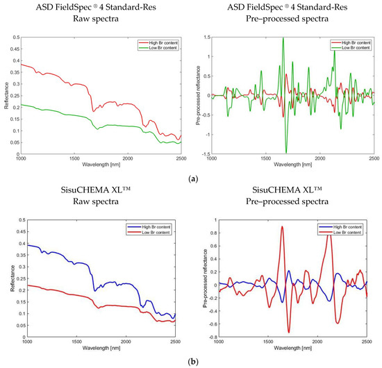 Raw and preprocessed reflectance spectra (1000–2500 nm) averaged according to the two groups of samples characterized by high and low bromine content, collected by ASD FieldSpec® 4 Standard-Res (a) and extracted from ROIs investigated by the SisuCHEMA XL™ (b).