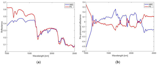 Average raw reflectance spectra (a) and preprocessed reflectance spectra (b) of the two reference polymer classes (ABS and PS), obtained after ROIs selection on SisuCHEMA XL™ data (wavelength range: 1000–2500 nm).