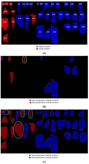In the case of ASD FieldSpec® 4 Standard-Res data (Table 4), during the calibration phase, Sensitivity and Specificity values were 0.833 and 1.000 for “High Br content” and 1.000 and 0.833 for “Low Br content”, respectively. As shown in Figures S1 and S2, three plastic scraps were not correctly assigned to their real classes (E4, E20, and E60). In the prediction phase, Sensitivity and Specificity values were 0.857 and 1.000 for “High Br content” and 1.000 and 0.857 for “Low Br content”. In this case, sample E14 was misclassified as a “Low Br content” scrap in prediction. Concerning the performance parameters related to SisuCHEMA XL™ average spectral data (Table 5), during the calibration phase Sensitivity and Specificity values were 0.900 and 0.833 for “High Br content” and 0.833 and 0.900 for “Low Br content”, respectively. Sample E20, E42, and E60 were not correctly assigned to their real class. The built classification model, in prediction, confirmed the good performance achieved in calibration (Sensitivity = 0.886, Specificity = 1.000 for “High Br content” and Sensitivity = 1.000, Specificity = 0.886 for “Low Br content”). In this case, the model did not recognize sample E14 as a “High Br content” one. Finally, the performance parameters related to the PLS-DA classification of the validation image set and global image set are reported in Table 5. For the validation set, the results showed that all the samples, except E14, were correctly classified (Sensitivity = 0.950, Specificity = 0.951 for “High Br content” and Sensitivity = 0.951, Specificity = 0.950 for “Low Br content”). For the global set, the performance parameters showed also in this case good values (Sensitivity = 0.881, Specificity = 0.932 for “High Br content” and Sensitivity = 0.932, Specificity = 0.881 for “Low Br content”), with four samples incorrectly classified: E42, E14, E60, and E20. With reference to the latter case, the classification results are also presented in terms of prediction maps in Figure 8, for both validation image set and global image set, together with the false-color image, indicating the true class membership, highlighting the few misclassified fragments. All the misclassified samples show flat spectra with low reflectance intensities, as can be seen in Figure 5 and Figure S3 (between 0.16–0.2).