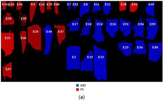 A similar performance was achieved by applying the classification model based on hyperspectral images mosaic global set. The prediction map resulting from the PLS-DA is shown in Figure 9, together with the false-color image, indicating the true class membership (Figure 9a). As can be seen in Figure 9b, PS samples (E31, E39, E46, and E57) were incorrectly classified as ABS (Sensitivity = 0.985, Specificity = 0.682 for ABS and Sensitivity = 0.682, Specificity = 0.985 for PS).