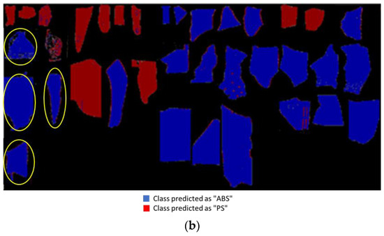 The observed misclassification in discriminating ABS and PS was also observed by other authors. Wu et al. (2020) reported that only 72.8% of PS was correctly classified, and the remaining percentage was misclassified as ABS in PLS-DA classification using NIR spectroscopy (900–1700 nm). Similar results were also achieved by Amigo et al. (2015) using this approach. In this latter case, a large number of pixels were not correctly assigned to the real polymer class [33].