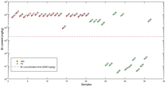 Samples labeled according to the plastic type (ABS and PS) versus Br content (mg/kg) plot. Br concentration limit, as reported from CENELEC technical specification (CENELEC CLC/TS 50625–3–1, 2015), is shown as a red slashed line.