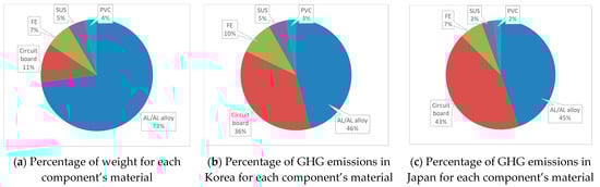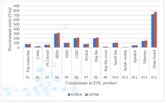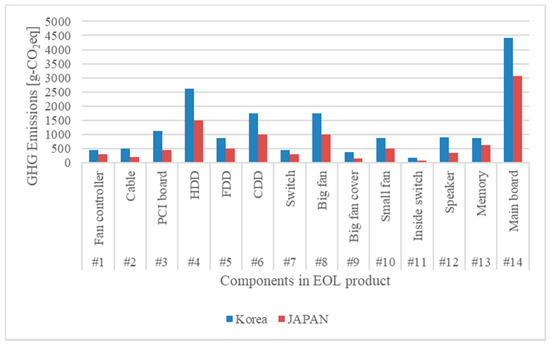 - Total GHG emissions are 17,116 [g-CO2eq] in Korea, which is approximately 1.7 times higher than the 10,040 [g-CO2eq] in Japan. The procurement cost and profit by reuse and recycling were almost the same in both countries. Most of the reuse profits were priced at a similar level, except for two components. The price in Korea for the #3 PCI Board was more than double, and one for the #14 Main Board was more than five times higher than the Japanese prices in Korea. When producing new products, Japan’s production of low GHG with similar procurement amounts could be a better choice.