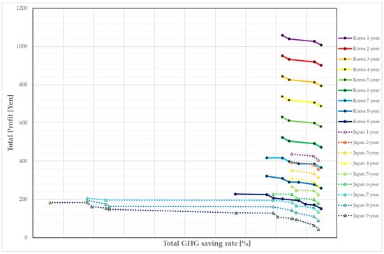 - The selection in the life cycle option based on usage year indicated that both countries’ data fell by the same gap of profit each year. The Korean cases resulted in a minimum GHG saving rate of 80% or more, even if the usage year increased; however, the Japanese cases brought a minimum GHG saving rate of 50% when the number of usage years increased. The Korean cases did not make a higher profit in shorter usage years, but it always obtained a more than 80% GHG saving rate. Even if the length of use-years increased, the Japanese cases could have similar profits as the results of the previous period if they chose between 50% and 70%. This is because only components with large profits from recycling compared to GHG emissions are selected for the life cycle options between 50% and 70%.