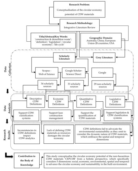 The literature shows that the rationale in the current CDW definition hampers, rather than supports, the circular economy. The dominant role of the obsolete linear economic model of “make–consume–waste” [87] is evident in the construction industry as the industry is responsible for the consumption of vast quantities of materials and the generation of billions of tons of CDW materials annually [37]. Therefore, it is essential to reconsider CDW materials as valuable resources that can advance the circular economy and promote the environmental sustainability of construction projects [6,88,89].