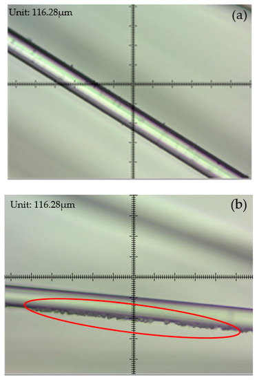 Ethyl acetate and toluene were used to remove the surface sizing agent. First, 45 g of the sample were soaked in 500 mL of organic solvent at room temperature for 30 min. Then, the sample was processed by ultrasonic vibration for 5 h. During the ultrasonic vibration, the surface structure of the sample was observed with a 400× optical microscope every hour, and an X-ray diffractometer (Rigaku, MiniFlex, Tokyo, Japan) was used to analyze the sample to evaluate the removal of the surface sizing agent.