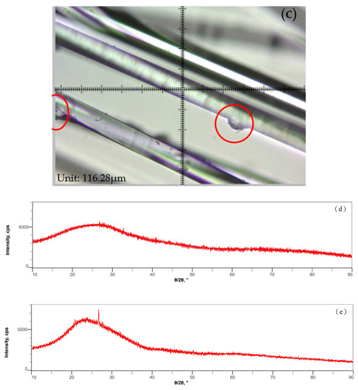 Figure 1 shows the microscopic images of glass fiber waste under different solvent treatments. By comparing Figure 1a,b, it can be seen that there is a distinct layer coated on the glass fiber and this coated layer possesses minor damage by ethyl acetate under ultrasonic for 5 h. The ethyl acetate tests (data not shown here) of various treated hours present similar phenomena to Figure 1b. In addition to the incomplete removal of surface sizing agent from the glass fiber waste, the procedures with organic solvents consume a relatively long time. Moreover, such a technique yields another liquid waste (i.e., used organic solvents) that also need to be effectively treated. Taking the above into consideration, the removal efficiency of solvent technique is not effective. Likewise, the same conclusion pertaining to toluene solvent can be drawn by comparing Figure 1a,c. In Figure 1c, some irregular obstructive can be observed. Figure 1d shows the XRD spectrum of using organic solvents to remove sizing agent and Figure 1e shows the original waste glass fiber XRD spectrum. By comparing the two, the effect is not obvious.