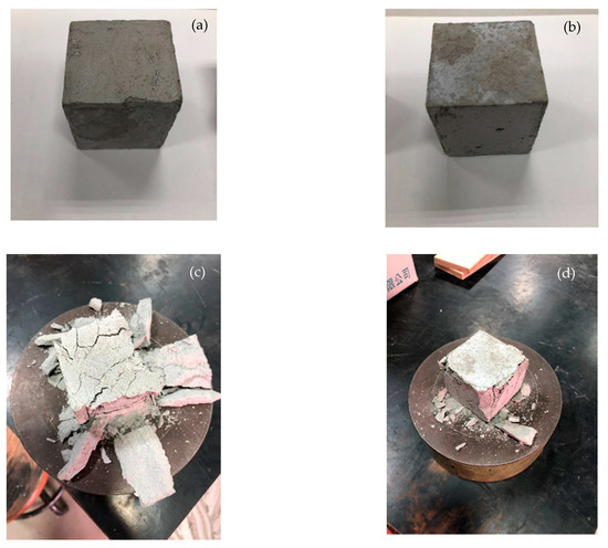 The images of concrete samples under different situations: (a) Concrete No. 1 made of cement and sand; (b) concrete No. 2 made of cement and heated glass fiber waste; (c) compressive test of concrete No. 1; (d) compressive test of concrete No. 2.