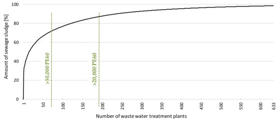 In total, 237,900 t dry matter (DM) of sewage sludge are produced annually in all municipal WWTPs. Most (99%) of the total amount is attributed to WWTPs with more than 2000 PE60 [,]. This corresponds to an average of 11 kg DM/PE60/a, with sewage sludge production varying by province (between 7.3 in Styria and 16.8 kg DM/PE60 in Vienna). As shown in Figure 1, 80% of the sewage sludge originates from the 120 largest WWTPs.