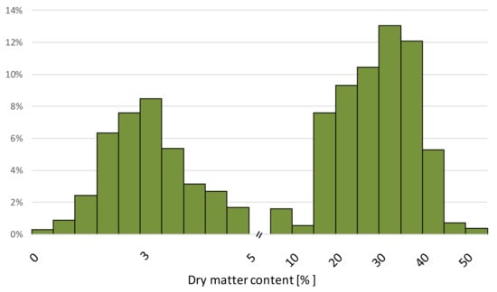 Frequency distribution of dry matter content (n = 1264) of sewage sludges for direct use on arable and grass land (y-axis—frequency of sewage sludge analyses; x-axis—dry matter content in percentage).