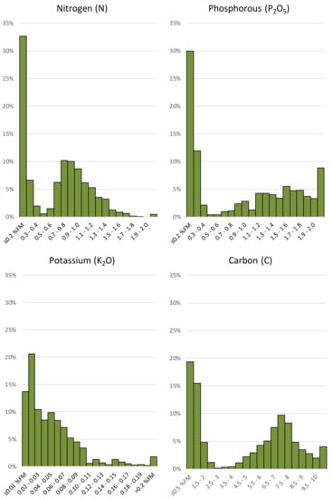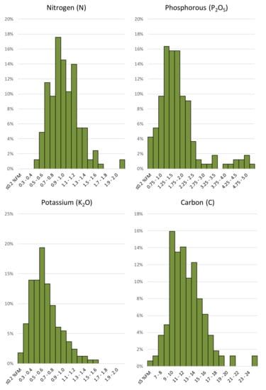 Frequency distribution of the contents of nitrogen, phosphorus, potassium, and organic carbon of Austrian sewage sludge composts (n =165) (y-axis—frequency distribution of compost analyses; x-axis—nutrient content of fresh matter in percentages).