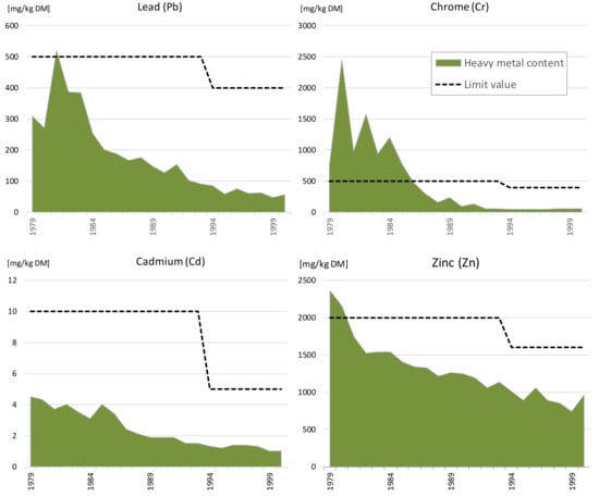 Development of selected heavy metal concentrations (Pb, Cr, Cd, and Zn) in Upper Austrian sewage sludge in the period 1979 to 2000 [].