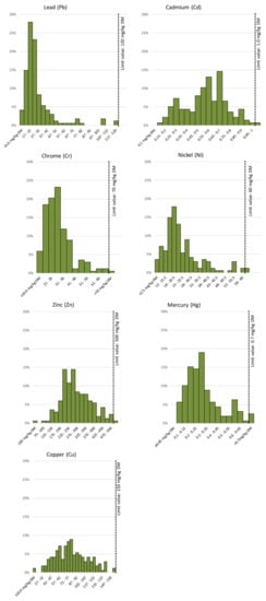 Heavy metal concentrations in sewage sludge composts in the period 2009 to 2019 (n =165) (y-axis—frequency distribution of compost analyses; x-axis—heavy metal content in mg per kg dry matter).