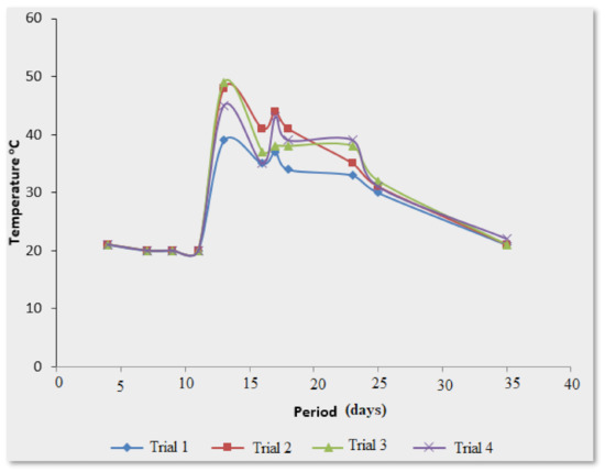 The pre-compost phase consisted of traditional composting, the purpose of which is to reach a composting temperature for pathogen neutralization. The temperature was measured during this phase and plotted versus time, as shown in Figure 3. The initial temperature was low and remained steady around 20 °C for almost a one-week period of the composting process and suddenly increased to a peak value between 40 and 50 °C for the four trials. After 3 days of peak values, the temperature decreased slowly but remained high around 40 °C for almost 10 days before gradually falling overtime to 22 °C at the end of day 30 of the pre-composting process. During the process, the temperature probe was replaced due to malfunction, which may have missed higher temperature values of the composting process; however, the temperatures achieved were encouraging and showed that the addition of post-consumer cotton textile waste did not negatively affect this stage of the process. Additionally, a visual inspection of the compost during this phase showed large particles of individual constituents (e.g., leaves), indicating that the composting process was not complete. The results obtained at the end of the pre-composting process demonstrated that the composting waste had achieved partial stabilization. The major issues with single traditional thermophilic composting are the long duration of the process, the frequency with which the material is turned, the need for the material to be reduced in size to provide the required surface area, the loss of nutrients during the prolonged composting process, and the heterogeneous nature of the product [11]. In fact, in addition to achieving the desired temperature for composting, pre-composting would have the advantage of accelerating the vermicomposting process by making the waste readily biodegradable [21]. For many various solid wastes, this phase does not last long, usually taking 5 to 10 days for their completion, but cotton wastes require longer periods from 20 to 25 days or more for their decomposition [22].