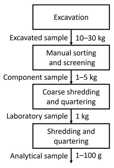 Waste sampling at the landfill was carried out by a bucket excavator along the profile of the waste stockpile with an interval of 0.5–1.0 m vertically. Algorithm of laboratory samples preparation is shown in Figure 2. At each point and precise depth, 2–4 samples were taken, weighing 10–30 kg each. Total of 24 samples with a final weight of about 450 kg were transported to the laboratory for further analysis.