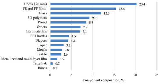 In southern countries, for example, India and China, the share of the small fraction ranges from 71 to 75% [31,32], which is higher compared to European countries. For example, in Hungary, the share of the small fraction is 50%, in Estonia—54%, in Austria—68% [8,21,22]. It depends on the fact that in European countries the share of waste packaging (plastic, glass, paper, metal) is significantly predominant. For example, in Austria the share of packaging is 15.0%, in Hungary—28.4%, in Estonia—23.9% [8,21,22], even considering the ban for valuable components landfilling.