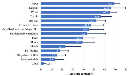 The components with the highest moisture value included waste paper (69.1%), diapers (65.8%) and wood (65.0%) (Figure 2). As noted above, studies of the thermal properties of “fresh” waste were performed [23,24], and if the moisture content of individual components of “fresh” waste and excavated waste is compared, the moisture content of some components, such as diapers, is almost identical. The moisture content of waste paper and wood in the composition of “fresh” waste is respectively 2.2 times and 4 times lower than in excavated waste. This is due to the fact that waste paper, cardboard, and wood are buried in contact with high-moisture components for a long time, which leads to full or practically full moisture saturation of these components. The lowest humidity value (2.5%) is characteristic of glass, for which moisture content is determined by the presence of adhering contaminants. Despite the fact that the polymer films themselves are not hygroscopic, as well as 3D plastics, moisture droplets and wet pieces of landfill material adhere well to the large surface of the films.