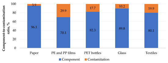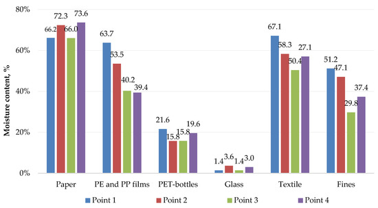 It should also be noted that moisture content, ash content and component contamination were determined for each component at each sampling point. However, six components with the most clearly differentiable indicators (waste paper, PE and PP films, PET bottles, glass, textiles, and sifting) were selected for comparison.
