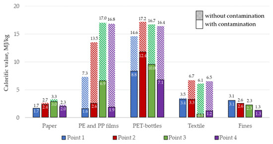 Based on the obtained results studying moisture content, ash content, and contamination of individual components, the net calorific value of the individual components and excavated waste was calculated for each sampling point. Figure 8 shows the estimated calorific value on a wet basis of individual components with contaminants and in a “clean” state (without contamination) at each sampling point.
