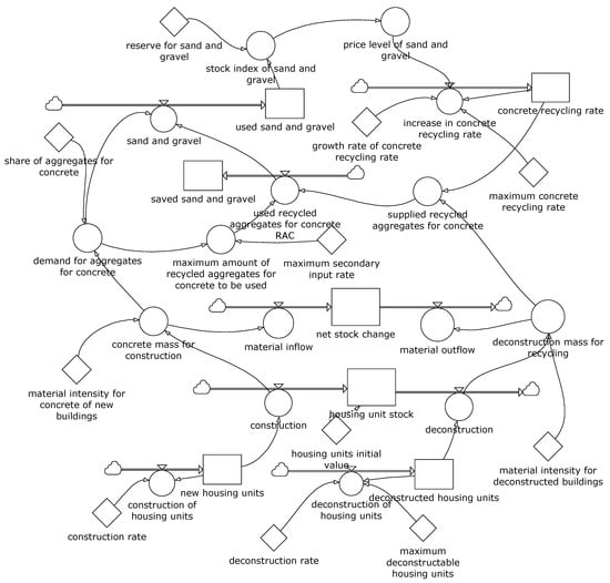 Even if there is a justified assumption that the use of RAC could contribute to a more resource efficient way of building construction, more reliable methodologies and simulation models are required to assess the production and use of RC concrete [21]. A promising approach for dynamic modelling and simulation of building mass flows is system dynamics (SD). In recent years, a number of studies have been published that have investigated the potential for recycling in the construction sector using SD mostly on the city level. One study developed an SD model to evaluate alternative type of recycling center under different policy and economy options, using the city of Chongqing as a case study [22]. Another recent study developed an SD model for the building stock of the city of Jinan to estimate the future environmental impacts [23].