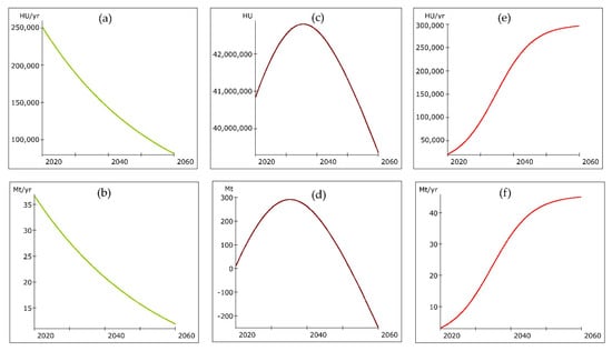 Activities in the German residential building sector from 2020 to 2060 shown by the evolution (a) of the ‘construction’ measured in housing units per year (HU/yr); (b) of the related ‘concrete mass for construction’ measured in mega tons per year (Mt/yr); (c) of the housing unit stock measured in housing units (HU); (d) of the ‘net stock change’ of construction material measured in mega tons (Mt); (e) of the ‘deconstruction’ measured in housing units per year (HU/yr); (f) of the related ‘deconstruction mass’ measured in mega tons per year (Mt/yr).