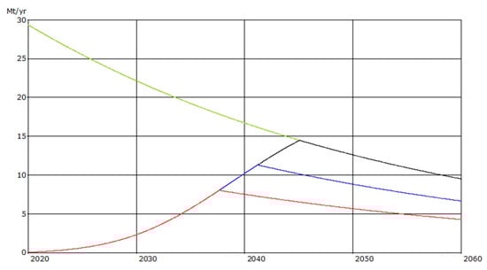 Due to the falling construction rate of new HU, the ‘demand for aggregates for concrete’ is also decreasing. In 2020, it is 29.37 Mt/yr and goes down to 9.50 Mt/yr in 2060. In all three scenarios, the evolution of the ‘used recycled aggregates for concrete’ starts at a very low level from 0.32 Mt/yr in 2020 and increases to 7.95 Mt/yr by 2038. In the RC scenario, 2038 is the peak in the evolution of the ‘used recycled aggregates for concrete’ and it then steadily declines to 4.28 Mt/yr by 2060. In the SI scenario, the evolution of the ‘used recycled aggregates for concrete’ reaches the peak in 2041 with 11.05 Mt/yr and then steadily declines to 6.65 Mt/yr by 2060. Only in the RS scenario, the ‘used recycled aggregates for concrete’ are able to completely fulfill the ‘demand for aggregates for concrete’. The evolution of the ‘used recycled aggregates for concrete’ peaks in 2045 with 14.44 Mt/yr and then steadily declines to 9.50 Mt/yr by 2060.