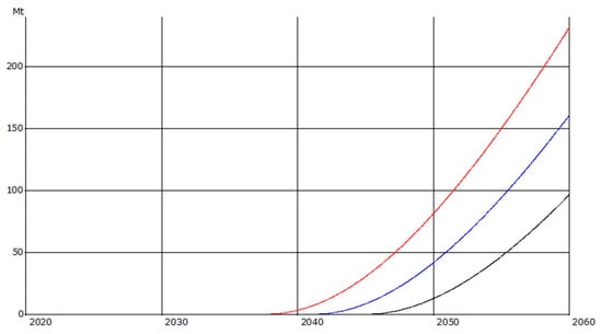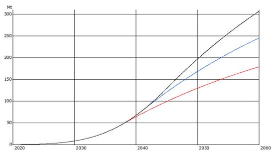 Evolution of ‘saved sand and gravel’ in the different scenarios from 2020 to 2060, measured in mega tons (Mt): Recycling (RC) scenario (red), Secondary Input (SI) scenario (blue), Resource Saving (RS) scenario (black).