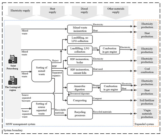 This study employs LCA to estimate the environmental impact of the waste management system in Saint Petersburg and the Leningrad region. The LCA method is widely used for such purposes [16]. This study follows ISO 14040 [31] and ISO 14044 [32] standards. The modeling was performed in GaBi software (database version 2020.2) (Sphera Solutions GmbH, Leinfelden-Echterdingen, Germany) with the integrated ecoinvent database (version 3.7) using the “allocation, cut-off by classification” system model provided by default with the software. The analysis is mostly based on secondary data obtained from scientific literature and life cycle inventory (LCI) databases; the use of primary data is limited. Where relevant, the treatment of inventory data is reported in Supplementary Materials. MSW generated in the area is regarded as zero-burden. To deal with the multifunctionality of the studied system (i.e., its multiple product outputs), the avoided burden approach is applied. However, this study cannot be regarded as being a fully consequential LCA study, as it is limited to consideration of average effects rather than marginal effects.