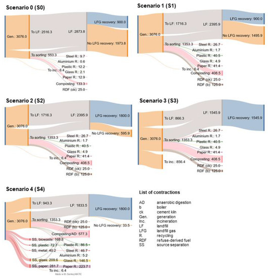 MSW flows in scenarios. Numbers indicate flow masses in Gg.