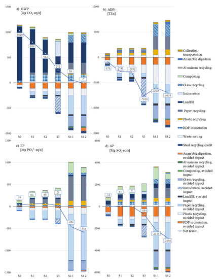 Global Warming Potential (GWP) (a), Abiotic Depletion Potential (ADPf), (b), Eutrophication Potential (EP) (c), and Acidification Potential (AP) (d) of the MSW management system for the scenarios studied: S0—the current situation, S1—planned development by 2024, S2—LFG collection doubled, S3—incineration of mixed MSW added, S4—source separation added (S4.1—composting of organic waste, S4.2—anaerobic digestion of organic waste).