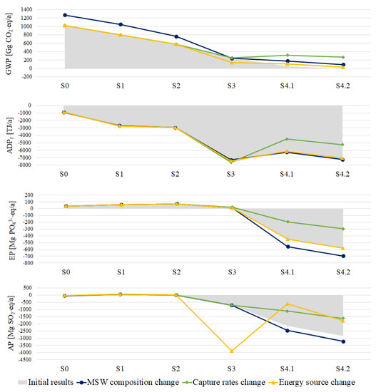 Capture rates in source separation can be expected to be lower during the first years of the separate collection of recyclable material. To assess the environmental impact of the MSW management system on the earlier stages of source separation implementation, capture rates two times lower are assumed: 8% for organic fraction, 8% for metals, 6% for plastics, 18% for paper and cardboard, and 22% for glass. The performance of the MSW management system changes significantly as EP, AP, and ADPf increases by 56%, 49%, and 25%, respectively (S4.1). The ranking of the scenarios for GWP changes, and the waste incineration scenario (S3) becomes the most favorable.