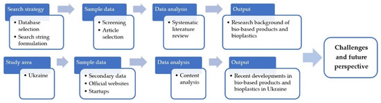 An analytical method, combining a systematic literature review and content analysis, was employed in this study. First, a systematic literature review based on the PRISMA statement [14] was carried out to provide a state-of-the-art of bioplastics and bio-based materials applications, production, and utilization worldwide. Then, content analysis was conducted on the recent advancements in the field of bio-based products and materials and relevant initiatives in Ukraine. The overall research framework is illustrated in Figure 1.