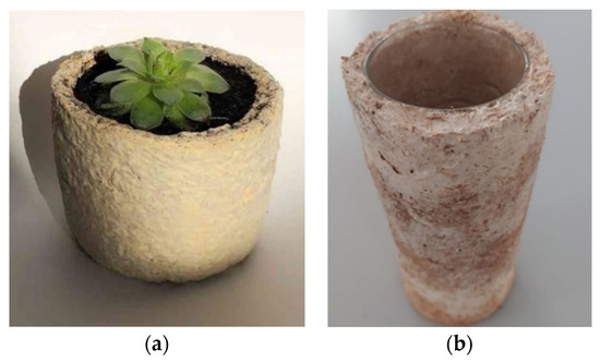 Mycelium-based biodegradable polymers: (a) flowerpot made from mycelium (Open source photo) [55]; (b) experimental sample of mycelium biopolymer (Open source photo) [56].