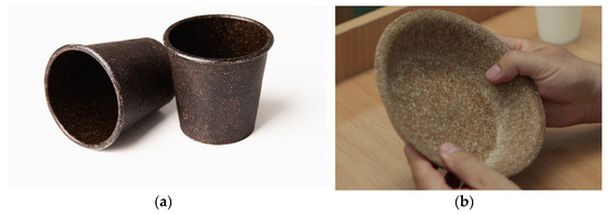 Biodegradable disposable tableware: (a) a laboratory prototype of disposable tableware based on biomaterial from spent coffee grounds (Open source photo) [50]; (b) biodegradable disposable tableware based on the meal (Open source photo) [58].
