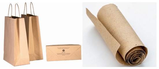 Leaf processing technology with a subsequent paper production was proposed by the startup “Re-leaf” as an innovative solution in the fight against traditional plastic. Figure 7 shows a craft paper made by using this technology with a density of 80 and 90 g/m2 that has appropriate physical and mechanical characteristics, making it suitable for packaging [8]. In the proposed technology, fallen leaves are separated from garbage, dried, and granulated. Then, granules are combined with waste paper in appropriate proportions, and rolls of paper are made. In the production of paper, cellulose fibers from fallen leaves can be used as the main or additional components. The peculiarity of products from fallen leaves is that sulfur and chlorine compounds are absent in the technological process, in contrast with traditional production. To obtain one ton of paper, 2.3 tons of fallen leaves are required, which saves an average of 17 trees. In addition, the environmental benefits would be a reduction of 15 times water consumption, and a reduction in CO2 emissions by 78.3%. Disposal of containers and packaging from fallen leaves involves the use of traditional recycling technologies [8].