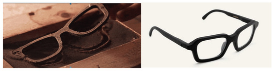 The production of environmentally friendly glass frames from spent coffee grounds (Figure 8) is another original solution, which was proposed by the startup “Ochis”. These coffee glasses are made of recycled coffee grounds, natural oils, and a biopolymer based on vegetable oils that are used as a binder. The glasses are waterproof due to a special type of hydrophobic coating. The technological process includes 39 stages of processing, most of which are performed manually. The biomaterial of the frames decomposes in about 10 years, under natural conditions [50].