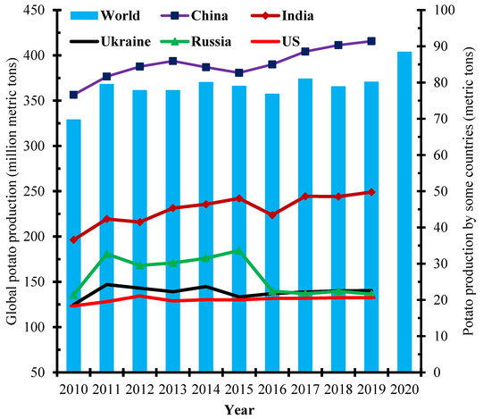- Potato Production Worldwide from 2002 to 2019 (In Million Metric Tons). Available online: https://www.statista.com/statistics/382174/global-potato-production/ (accessed on 29 August 2021).