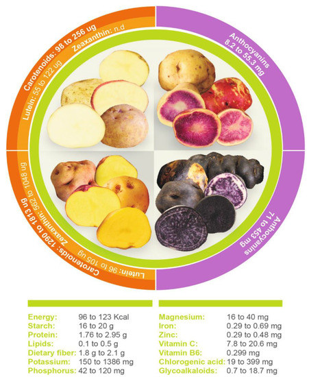 - Burgos, G.; Zum Felde, T.; Andre, C.; Kubow, S. The potato and its contribution to the human diet and health. In The Potato Crop: Its Agricultural, Nutritional and Social Contribution to Humankind; Campos, H., Ortiz, O., Eds.; Springer: Cham, Switzerland, 2020; pp. 37–74. [Google Scholar] [CrossRef]
