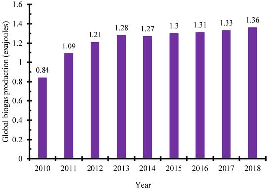 - Production of Biogas Worldwide (Exajoules). Available online: https://www.statista.com/statistics/481791/biogas-production-worldwide/ (accessed on 31 August 2021).