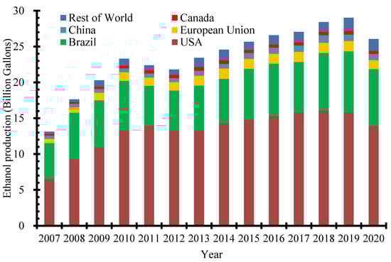 - Global Ethanol Production by Country or Region. Available online: https://afdc.energy.gov/data/?q=ethanol (accessed on 9 September 2021).