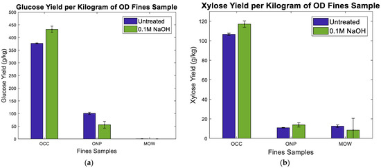 Figure 1a,b illustrate the glucose and xylose yield of the fines samples in grams of sugar per kilogram of oven dry (OD) fines input to the enzymatic hydrolysis. There was negligible loss of fines mass during pretreatment. OCC remained the highest producer of the fines samples in both glucose and xylose yield when adjusted for input mass. ONP xylose yield in both untreated and NaOH pretreated samples was comparable to that of MOW when adjusted for input mass.