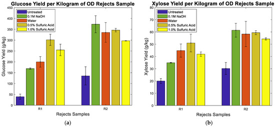 Overall, R2 performed better than R1 in glucose and xylose yield, both by percent yield and yield per kilogram of biomass as shown by Table 3 and Figure 2a,b. R2 had the highest percent glucose yield of 70% with water pretreatment, and the highest percent xylose yield of 88% with NaOH pretreatment. However, when these results were adjusted for input rejects mass, R2-S had both the highest glucose (373 g/kg rejects) and xylose (61.4 g/kg rejects) yield of the rejects due to its high cellulose content (51%). R1 had both its highest percent and mass yield of glucose and xylose after pretreatment with 0.5% sulfuric acid, possibly due to the higher filler (ash) content of the R1 samples, which required more neutralization in order for the acid pretreatment to have an effect on the pH [24]. For both R1 and R2 acid pretreated samples, lower acid concentration (0–0.5%) appeared to be better for both glucose and xylose yields, both by percent yield and yield per kilogram of rejects most likely due to extensive polysaccharide degradation and loss at lower pH [4].