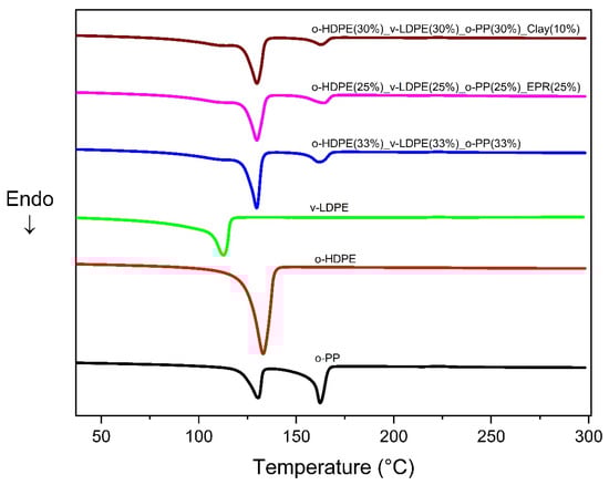 Differential scanning calorimetry of polymer blends composed of o-HDPE, v-LDPE o-PP, EPR and clay.