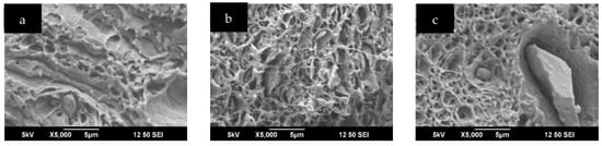 To evaluate the effects of clay and EPR on the morphology of the ternary blends, three ternary polymer blends (o-HDPE (30%)_o-PP (30%)_v-LDPE (30%), o-HDPE (30%)_o-PP (30%)_v-LDPE 30%)_clay (10%), and o-HDPE (25%)_o-PP (25%)_v-LDPE (25%)_EPR (25%)) were observed under SEM. The study of the morphological characteristics of the selected blends was essential to determine the phase interactions and miscibility of the constituent polymers. The fractured surface was investigated for the blends (Figure 2). The results indicate that the blend without any additive showed large voids, and this could be associated with the incompatibility of the phases. However, results from blends containing clay and EPR showed smaller voids with the exception of a large chunk of EPR appearing. This large chunk may be as a result of poor shearing of the EPR during micro-compounding at low speed. In addition, the EPR used was not received in the form of pellets, but the particle size was manually reduced before compounding. This result also indicates that the particle size of EPR is an important factor to consider when including EPR in a blend. Apart from the large chunks observed in the blend with EPR, there was generally a reduction of the void size in the blend. Increasing the speed of the micro-compounder may reduce the particle size of the EPR due to an increase in shear stress.