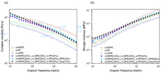 A strain sweep was run to determine a strain amplitude in the linear viscoelastic regime for the frequency sweep. A 10% strain was selected and used for further testing (Figure S2). Figure 3a shows the plot of complex viscosity versus angular frequency. The individual o-PP and o-HDPE both show a Newtonian plateau at low frequency, whereas the v-LDPE is more shear thinning in character over the whole frequency range. There is an increase in viscosity at low frequencies in all the blends, reflecting the influence of the v-LDPE in the blends. As Figure 3a shows, no plateau was observed for all the polymer blends tested and thus no Newtonian behavior was found for all the blends. Overall, o- PP and v-LDPE had the lowest magnitude of the viscosity. However, the viscosities of the o- PP and v-LDPE polymer blend increased when they were blended with o-HDPE, EPR, and clay. The clay and EPR may have acted like solid fillers, immobilizing chains at the interfaces and increasing the viscosities of the blend.